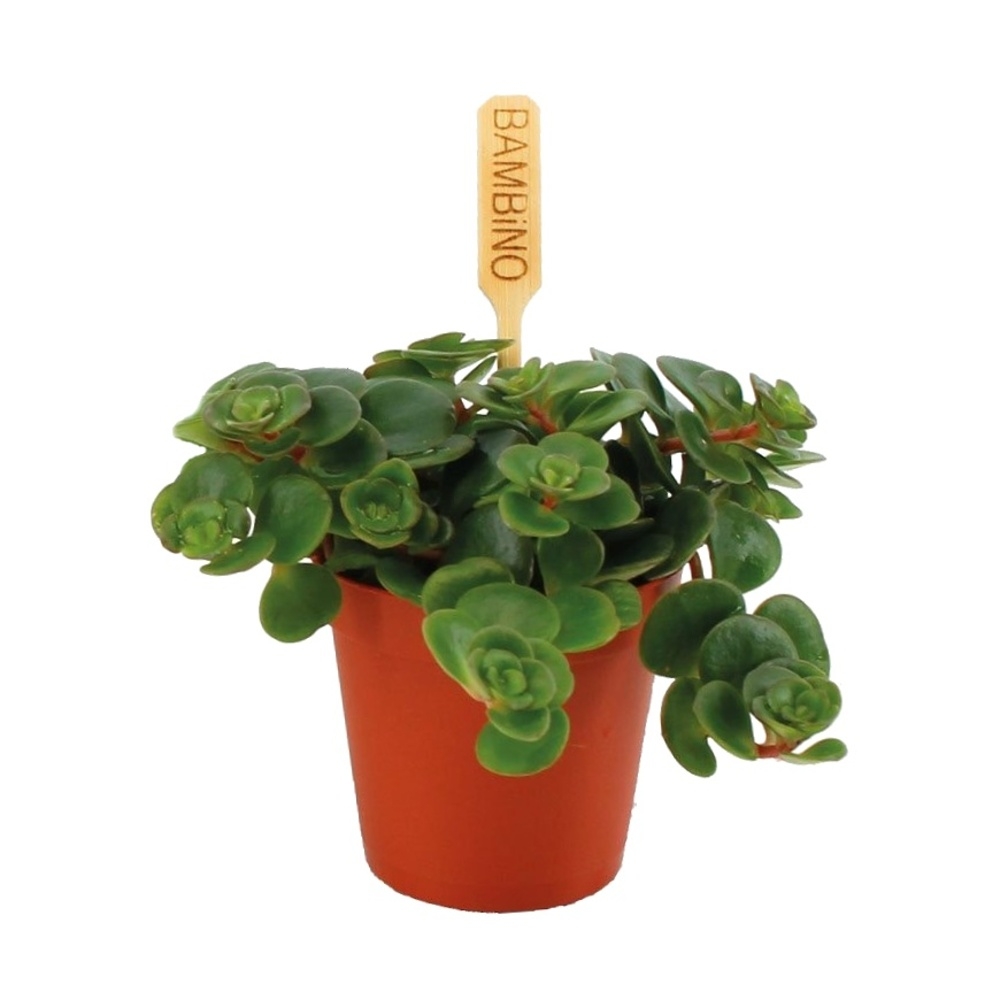 Sukulentní rostlina s tmavě zelenými dužnatými lístky, které jsou okrouhlé a jsou uspořádané okolo dužnatého stonku, který přepadá přes okraj květináče. Květy jsou žluté. Rostlina je nenáročná na pěstování a vhodná i pro začátečníky.