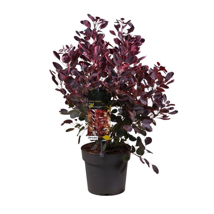 Atraktivní rozložitý keř s téměř kulatými listy, které mají tmavě červenou až vínovou barvu. Na podzim listy mění barvu na ohnivě oranžovou až červenou barvu. Růst je kompaktní, keř dorůstá výšky 1-1,3m a obdobné šířky. Květy jsou drobné, ale vyrůstají z nich nápadné růžové až vínové vlasce a jsou složené v květenstvích, která vás okouzlí v červnu až červenci.