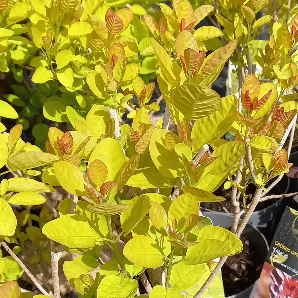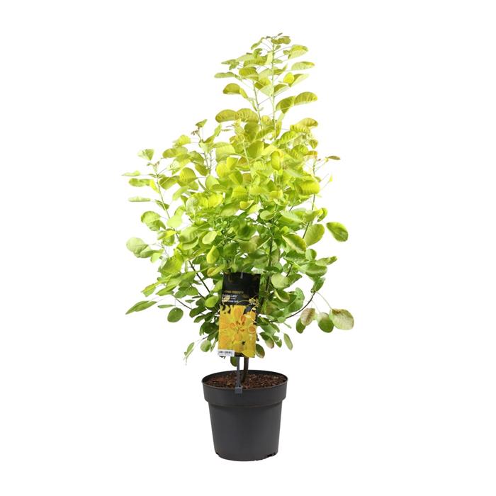 Atraktivní a rozložitý keř dorůstající výšky 2-3m a 2,5m šířky. Listy jsou okrouhlé, zlato-žluté, při rašení mají oranžový nádech. Na podzim listy mění barvu na ohnivě oranžovou. Květy jsou drobné, ale vyrůstají z nich nápadné růžové vlasce a jsou uskupeny v květenstvích, která vykvétají v červnu až červenci.