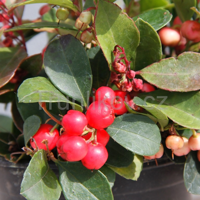 Stálezelená vřesovcovištní rostlina dosahující výšky do 20cm. Listy jsou široce vejčité, tmavě zelené, lesklé a pevné. Květy jsou bílé, zvonečkovité. Nepřehlédnutelná je na podzim, kdy dozrávají velké červené bobule.