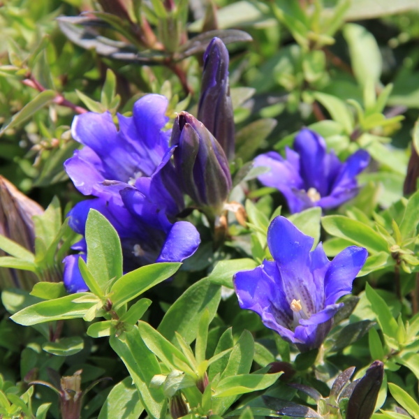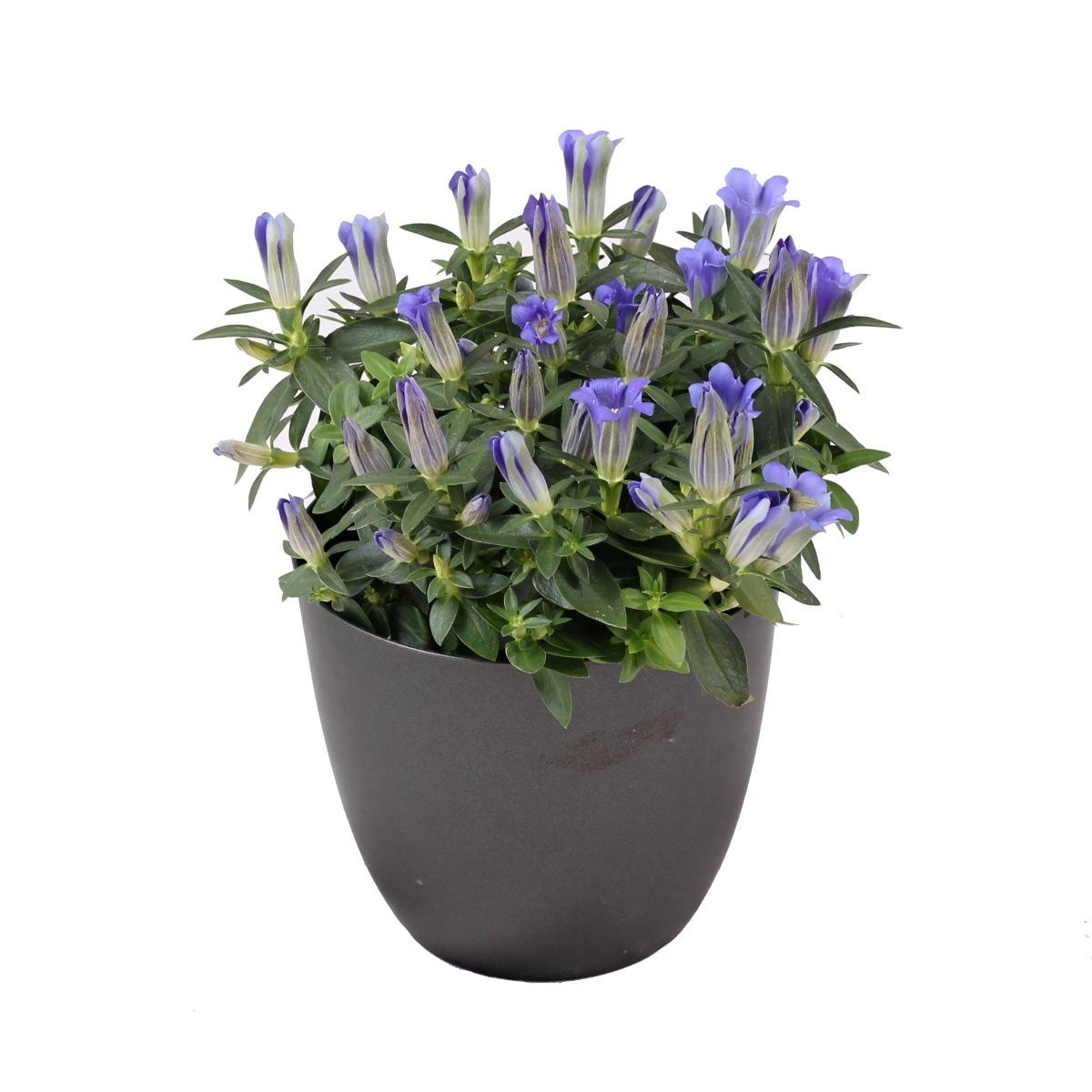 Nízký hořec dosahující výšky oklo 10-15cm. Listy jsou tmavě zelené, lesklé, vejčitě kopinaté. V květnu až červenci vykvétají tmavě modré květy.