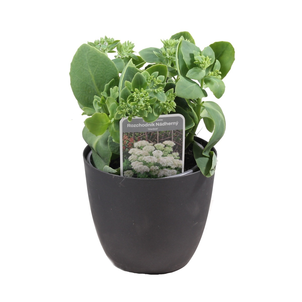 Nenáročná středně vysoká trvalka dosahující v době výšky až 60cm. Listy jsou šedo-zelené, dužnaté, neseny na pevných stoncích. Od srpna vykvétají chocholíky drobných bílých květů.