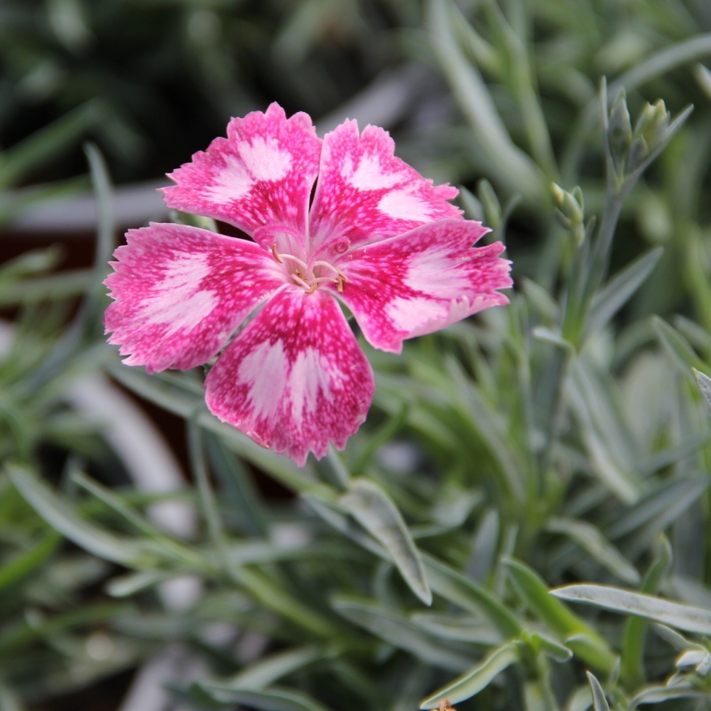 Trsovitě rostoucí trvalka dosahující výšky okolo 30cm. Listy jsou úzké, zelené s ojíněním. Od června vykétají bílo-růžové vonné květy.
