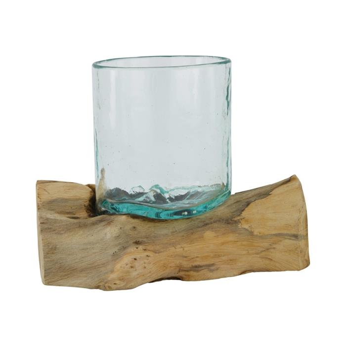 Vneste do svého interiéru jedinečný kus přírody s touto stylovou vázou z ručně foukaného skla usazenou na masivním dřevěném podstavci. Každý kus je originál – tvar skla se přirozeně přizpůsobuje nepravidelnostem dřeva, čímž vzniká naprosto unikátní kombinace.