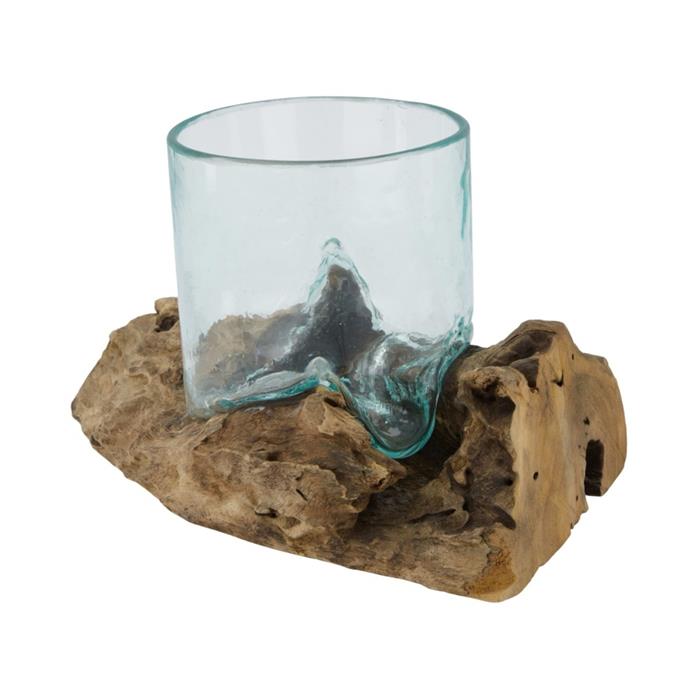 Vneste do svého interiéru jedinečný kus přírody s touto stylovou vázou z ručně foukaného skla usazenou na masivním dřevěném podstavci. Každý kus je originál – tvar skla se přirozeně přizpůsobuje nepravidelnostem dřeva, čímž vzniká naprosto unikátní kombinace.