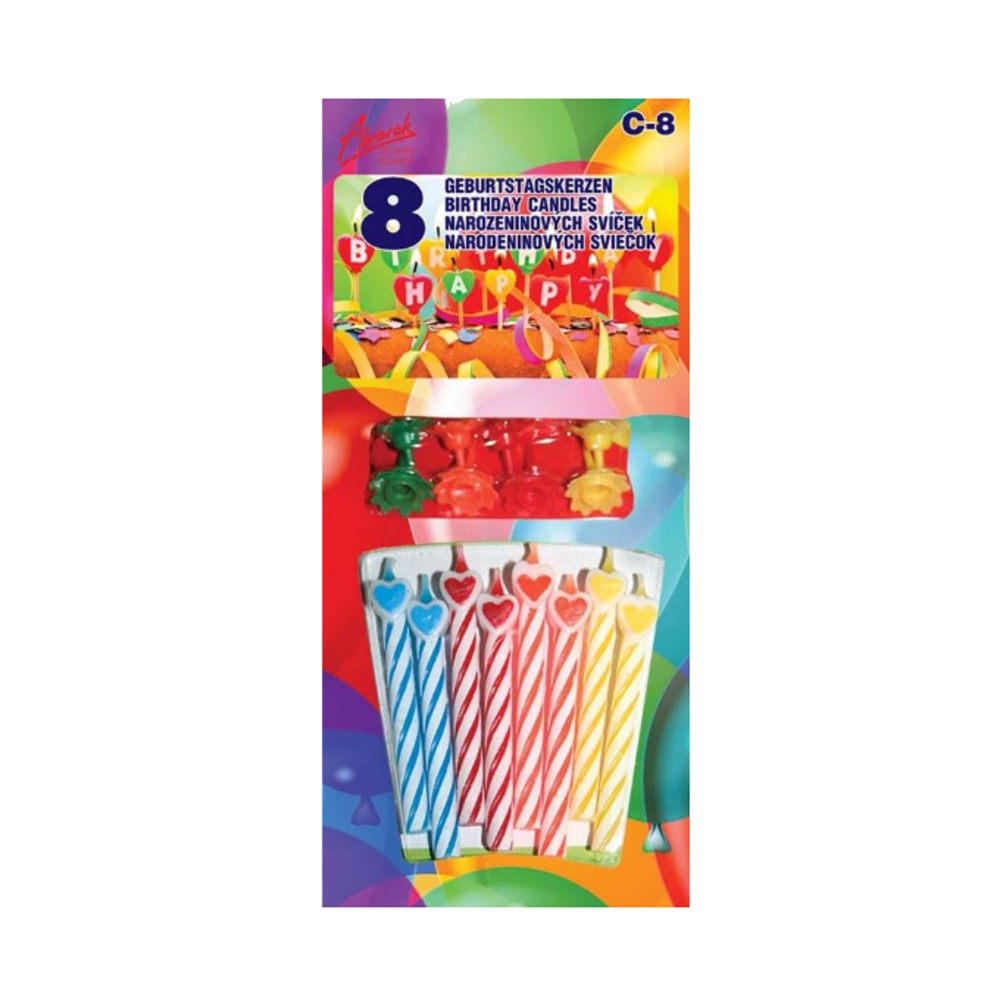 Vytvořte kouzelnou atmosféru a dodejte svému dortu slavnostní nádech s touto sadou klasických dortových svíček, které jsou ozdobenysrdíčkem. Sada je ideální pro všechny typy narozenin, výročí a oslav. Sada obsahuje 8 ks kvalitních dortových svíček a 8 ks plastových držáků, které zajistí bezpečné a stabilní umístění svíček na dortu.