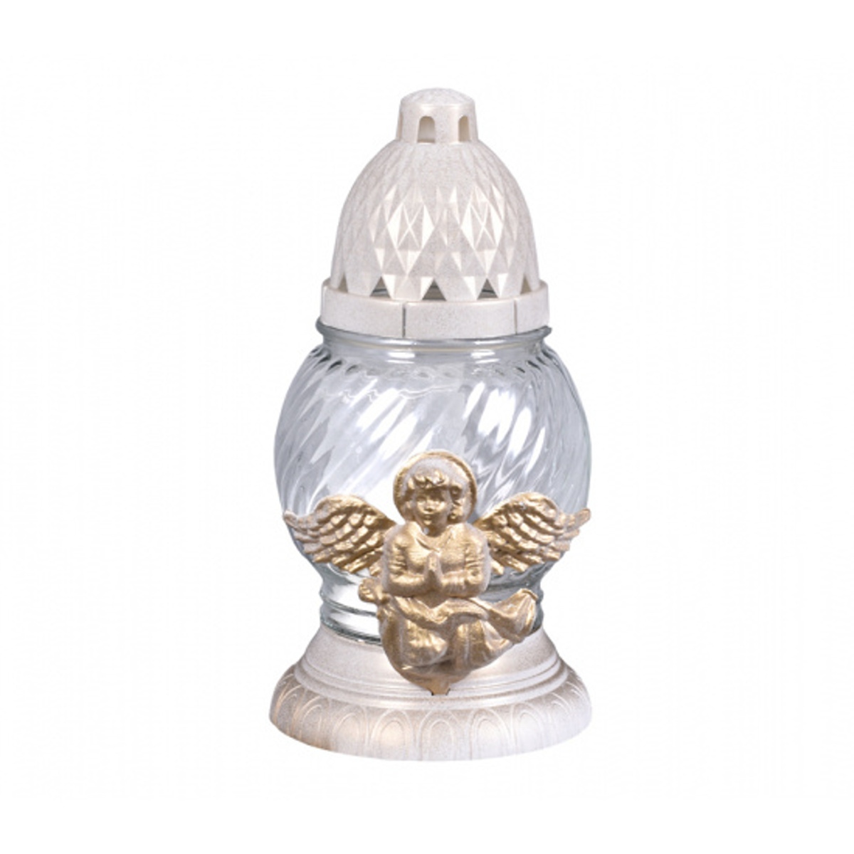 Skleněná hřbitovní lampa ve tvaru koule s plastikou anděla a s náplní. Použití je doporučeno pouze na nehořlavé podložce a pro venkovní prostředí. Doba hoření: 18 hodin. Rozměry: průměr 11 cm, výška 21 cm.