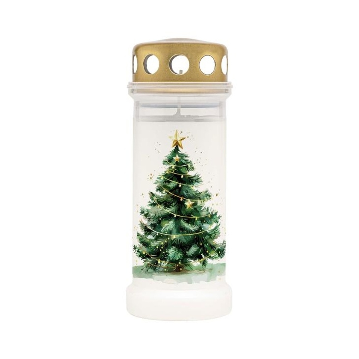 Bílá plastová hřbitovní lampička ve tvaru válce s vánočním motivem a s kovovým zlatým plochým víčkem. Velikost: d6,7 x 17 cm.
