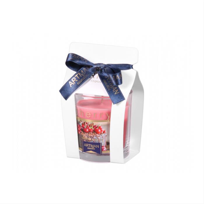 Svíčka ve skle s vůní třešňového koláče. Svíčka je zabalena v papírové dárkové taštičce s modrou saténovou mašlí. Hmotnost náplně: 130g. Výška: 8 cm, šířka: 7 cm.