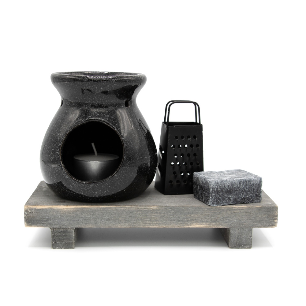 Dárková sada aromalampy, struhadla, prkénka a vonného vosku. Tato elegantní dárková sada VESUVIUS potěší každého milovníka vůní a relaxace. Stylová keramická aromalampa v černé barvě se spolu s vonným voskem postará o příjemnou atmosféru vašeho domova.