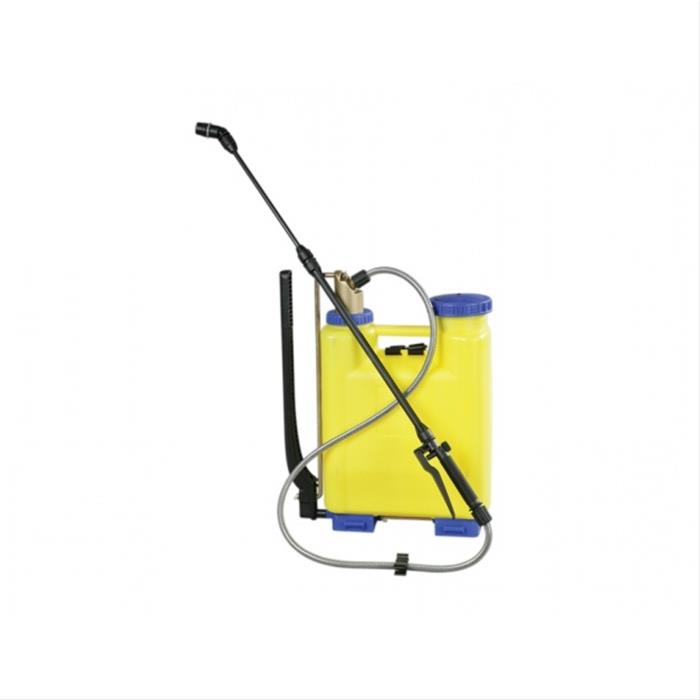 Zádový tlakový postřikovač ve tvaru zaobleného kvádru o objemu 12 l. Postřikovač je žlutý s černým nástavcem s postřikovací pákou, stříbrnou hadičkou, modrýma nožičkama a se šroubovacíma víkama. Propojení postřikovacího a tlakového vedení je z kovu. Popruh se připne na předem připravená místa. Aplikační kapalinu nalijeme pohodlně 10 cm širokým otvorem. Postřikovací páka umístěná z boku postřikovače slouží zároveň jako tlakovač s tlakem 3 bar. Tlak lze rychle upustit ventilkem. S postřikovacím ramenem se příjemně manipuluje. U trysky jde pohodlně regulovat síla a záběr průtoku kapaliny. Rozměry: h. 39 cm x v. 53 cm x š. 15 cm.