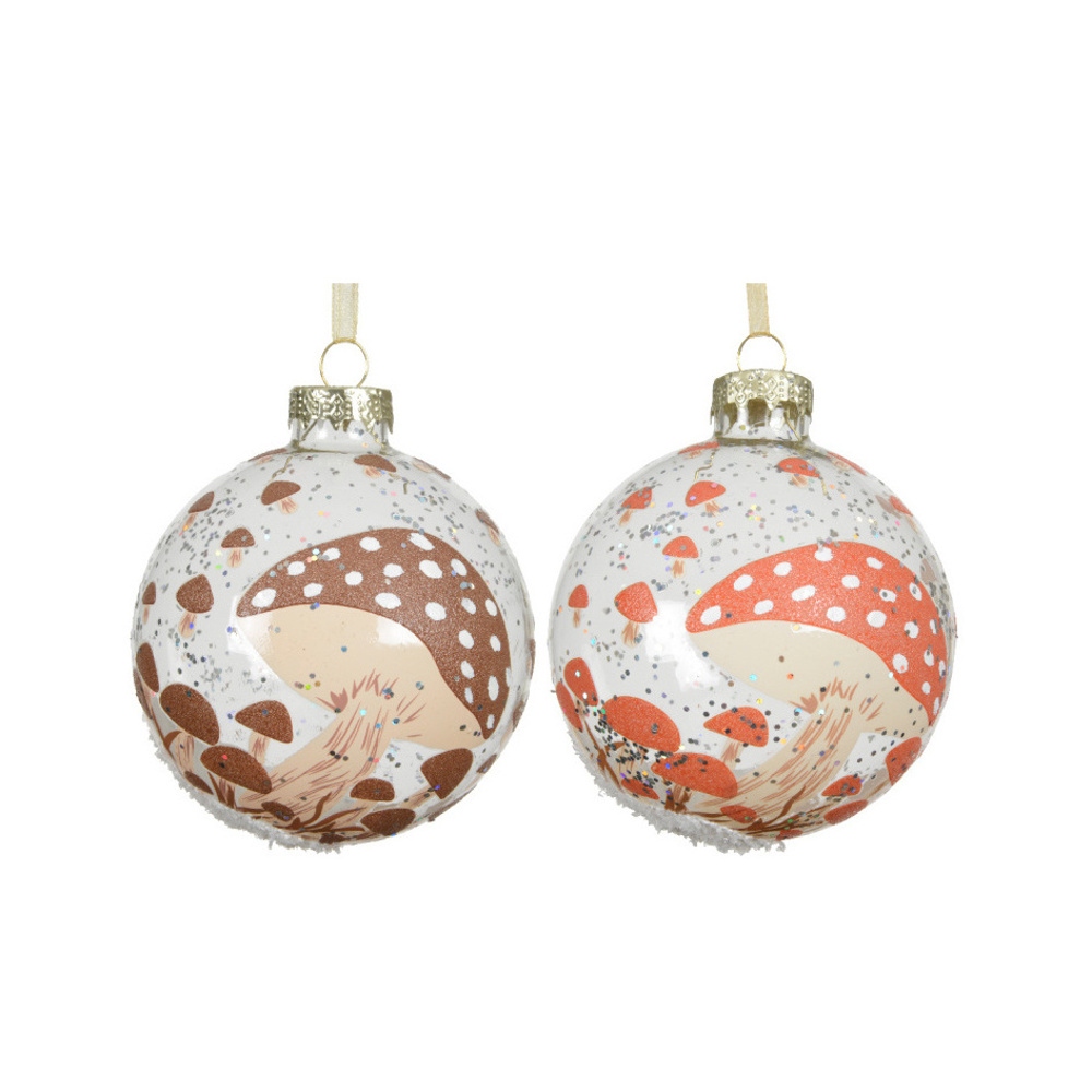 Ozdoba skleněná koule s houbami čirá s glitry mix 8cm