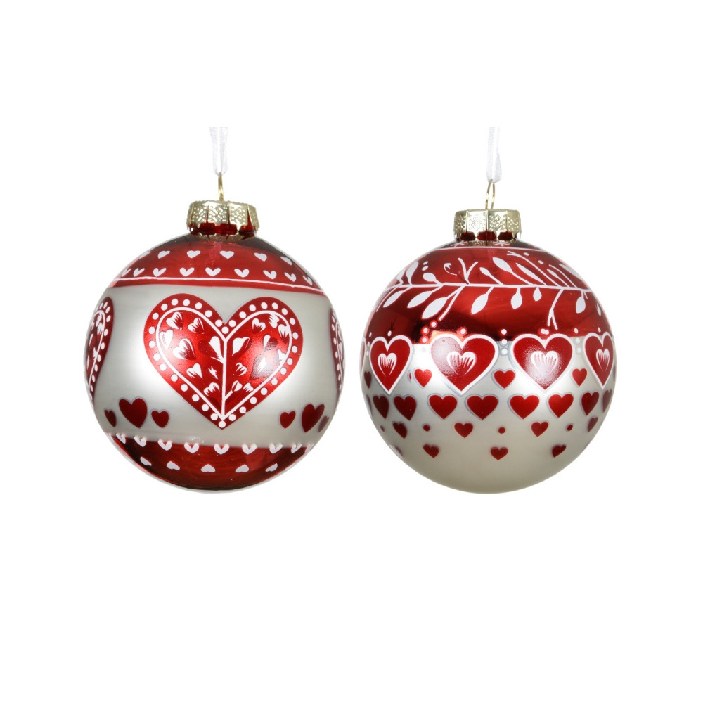 Ozdoba skleněná koule se srdíčky bílo-červená mix 8cm