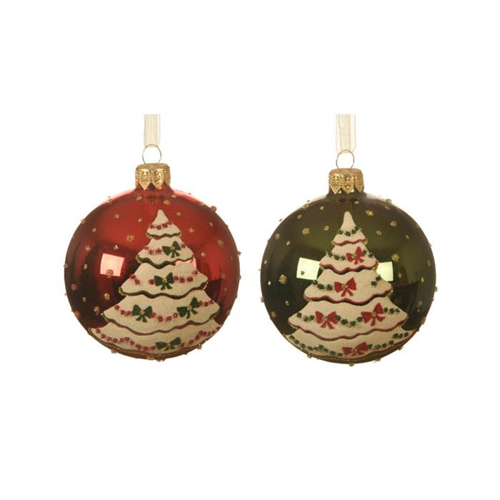 Ozdoba skleněná koule se stromkem a glitry červená/zelená mix 8cm