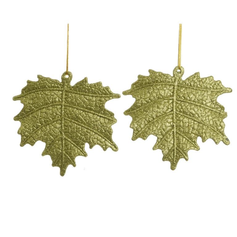 Ozdoba plastový list 2ks s glitry 10,5cm olivová