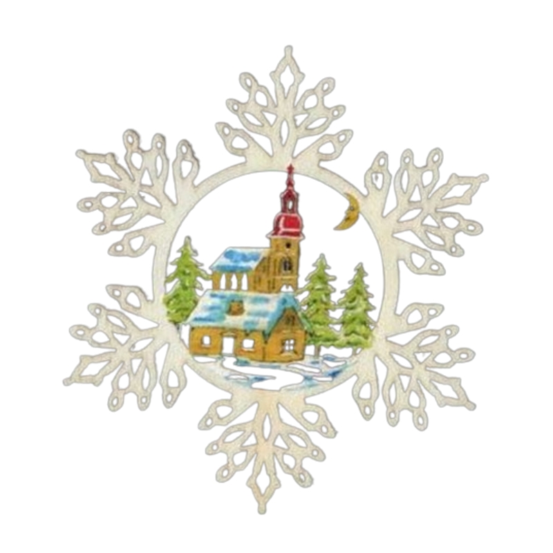 Půvabná dřevěná vločka s motivem kostela je ideální dekorací pro vánoční výzdobu. Precizně vyřezávaný design v přírodním dřevěném provedení dodává dekoraci tradiční a útulný vzhled, který se hodí do stolních aranžmá, věnců nebo jako samostatný dekorativní doplněk.