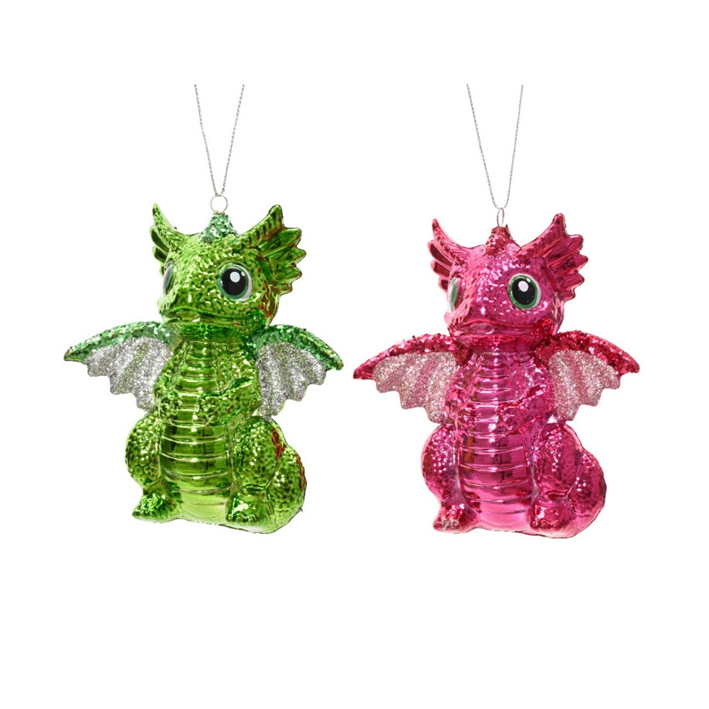 Přidejte do své vánoční výzdoby trochu magického lesku s touto plastovou ozdobou ve tvaru draka zdobenou třpytivými glitry v krásné kombinaci zelené a růžové barvy. Lehký materiál a jiskřivý povrch ozdobě dodávají sváteční kouzlo a originální šmrnc. Ozdoba v mixu provedení. Pokud si přejete konkrétní variantu, napište ji do poznámky, pokusíme se vyhovět. V případě nedostupnosti bude odeslán náhodný kus.