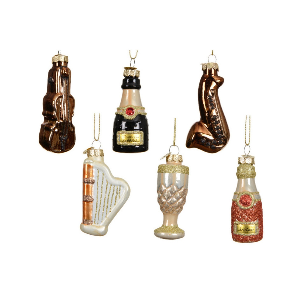 Oživte svůj vánoční stromek netradičními skleněnými ozdobami ve tvaru hudebních nástrojů, lahví nebo sklenic. Tento originální mix přináší svěží nápad do klasické výzdoby a potěší každého milovníka hudby, dobrého pití nebo netradičních detailů. Ozdoba v mixu provedení. Pokud si přejete konkrétní variantu, napište ji do poznámky, pokusíme se vyhovět. V případě nedostupnosti bude odeslán náhodný kus.