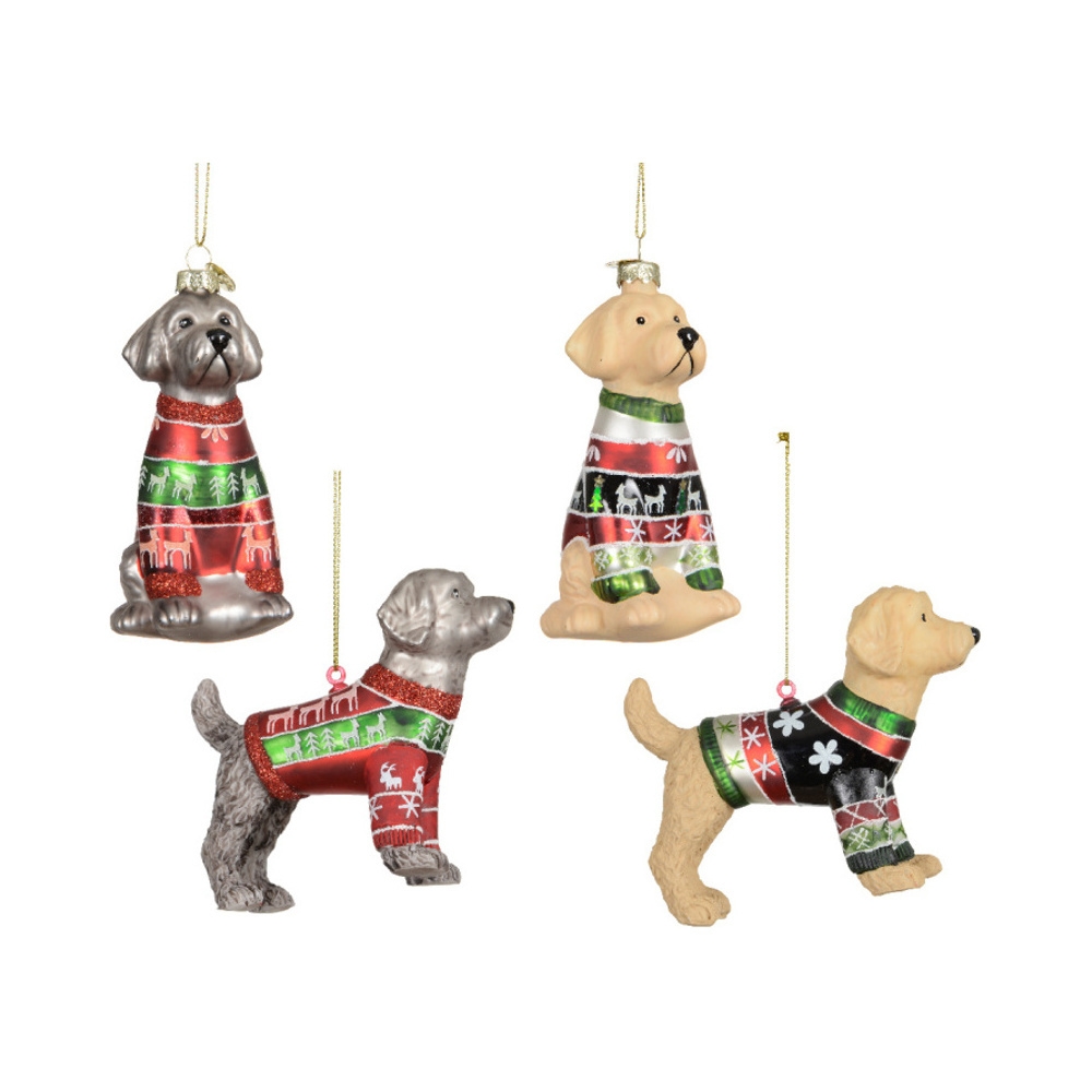 Ozdoba skleněný pes stojící/sedící ve svetru mix 9,5cm