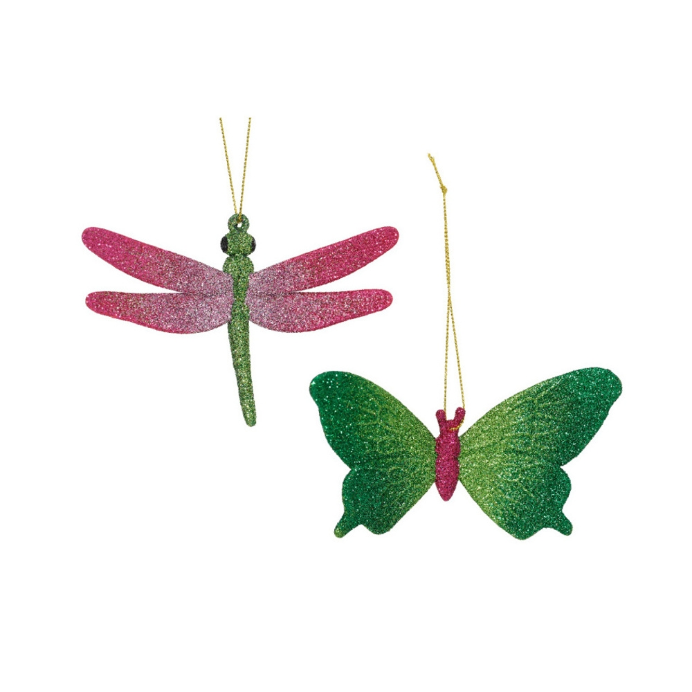 Ozdoba ve tvaru vážky a motýla, která je zdobená třpytivými glitry v kombinaci zelené a růžové barvy. Lehký plastový materiál zaručuje snadné zavěšení a odolnost během celé sezóny. Přinese na váš stromek netradiční detail. Ozdoba v mixu provedení. Pokud si přejete konkrétní variantu, napište ji do poznámky, pokusíme se vyhovět. V případě nedostupnosti bude odeslán náhodný kus.