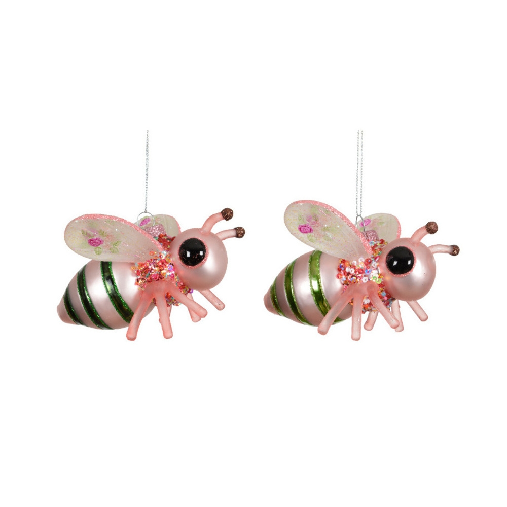Ozdoba skleněná včela s flitry zeleno-růžová mix 11,5cm