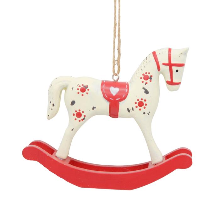 Roztomilá dřevěná ozdoba ve tvaru houpacího koníka přináší na vánoční stromek hravost a nostalgický šarm. Kombinace bílé a červené barvy podtrhuje tradiční vánoční atmosféru a dodává dekoraci kouzelný vzhled.