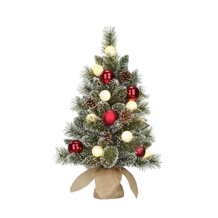 Vytvořte si doma tu pravou vánoční atmosféru s elegantním mini stromkem KAPRUN, který zaujme svou nadýchanou zasněženou siluetou a dekoracemi v podobě červených baněk a šišek. Stromek je navíc osazen 10 LED světýlky v teplé bílé barvě. Díky časovači a napájení na baterie ho snadno umístíte kamkoli bez nutnosti zásuvky. Baterie AA nejsou součástí.