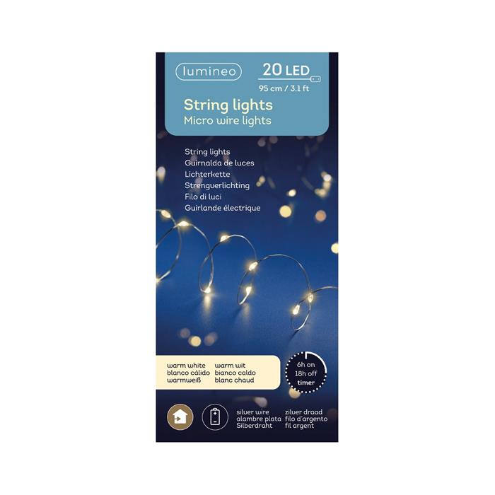 Elegantní a jemný světelný řetěz s 20 microLED diodami v teplé bílé barvě, který dodá vašemu prostoru moderní a slavnostní vzhled. Díky stříbrnému drátku působí nenápadně a decentně i přes den.