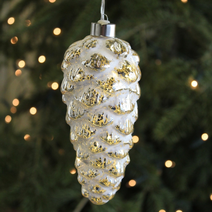 Skleněná ozdoba šišky s LED světýlkem.