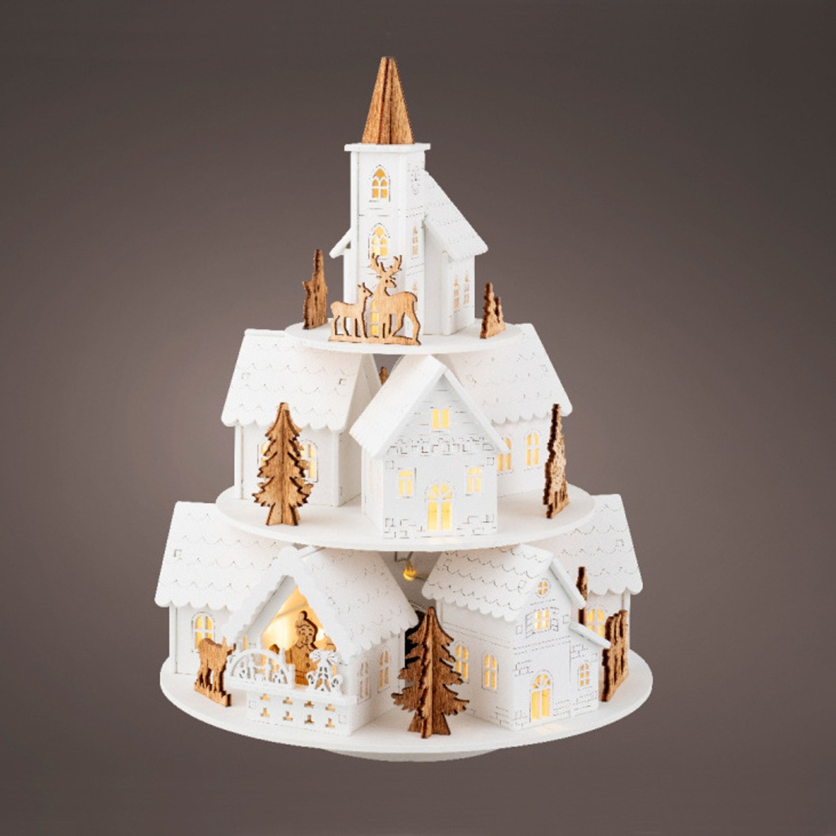 Působivá dřevěná vánoční dekorace ve tvaru třípatrového města vás okouzlí nejen svým detailním zpracováním, ale také jemným osvětlením a příjemnou hudbou. Ideální jako středobod sváteční výzdoby pro každý interiér.