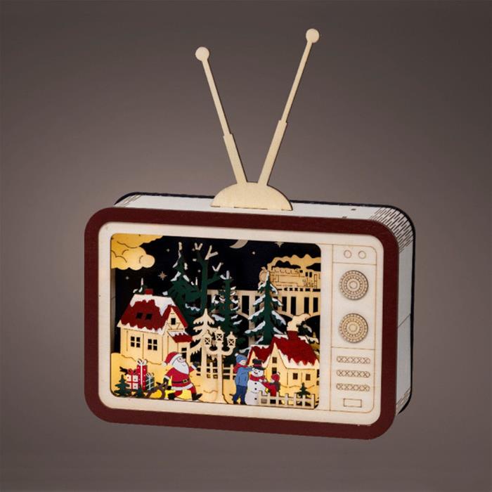 Originální dekorace ve stylu retro televize, která uvnitř skrývá vánoční scénu rozzářenou 9 teplými bílými LED diodami. Stylový doplněk pro sváteční výzdobu, který upoutá pozornost a navodí příjemnou atmosféru plnou nostalgie.