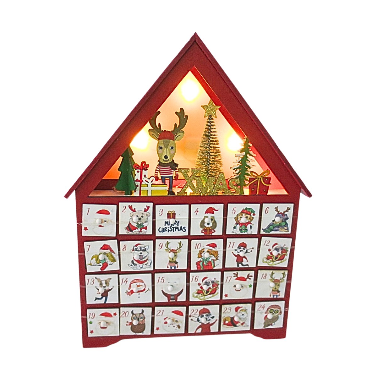 Domečkový adventní kalendář ze dřeva s LED, t.bílá bílo-červený 34cm