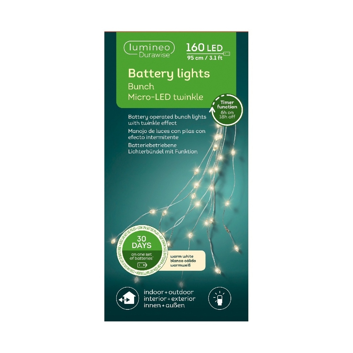 Svazek svítící venkovní Bunch 160LED t.bílá s časovačem, 8 funkcí na baterie stříbrný 95cm