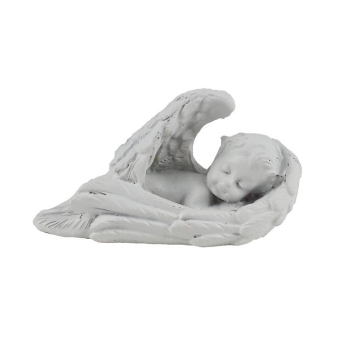 Nádherná a klidná soška anděla ležícího na andělském křídle, vyrobená z kvalitního polyresinu. Symbolizuje mír, ochranu a odpočinek – ideální jako dekorace, vzpomínka či dar.
