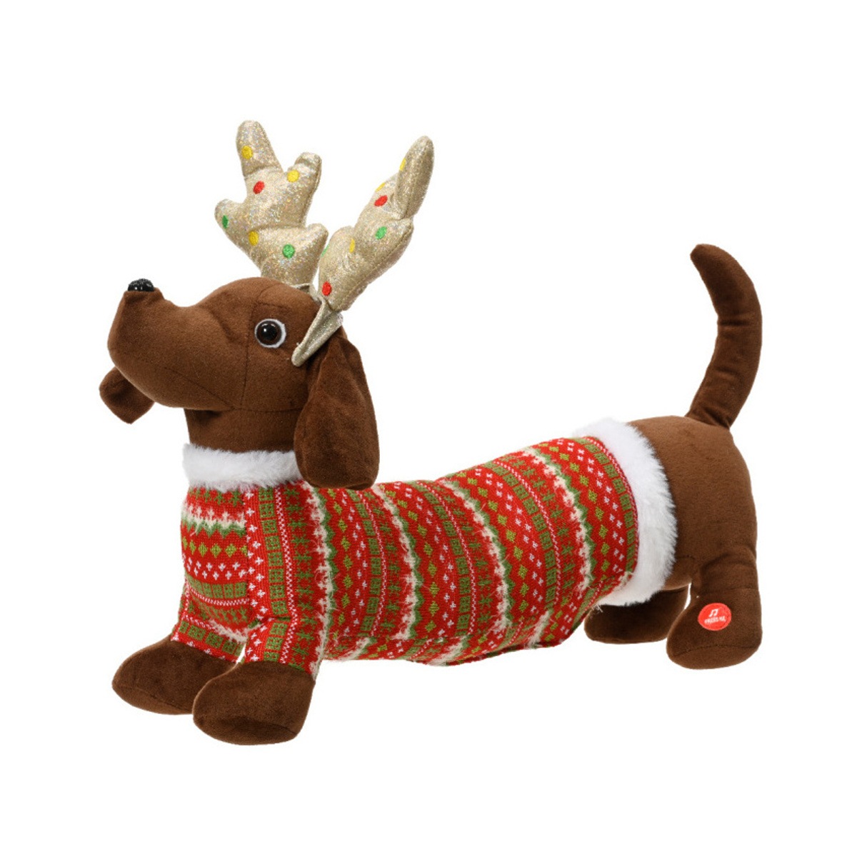 Roztomilý plyšový jezevčík ve vánočním svetru a se zlatými parohy se stane hvězdou vaší sváteční výzdoby! Tento pejsek není jen dekorace – po spuštění začne hrát, a tím vnese do interiéru ještě více radosti a sváteční atmosféry.