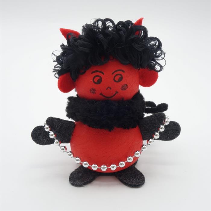 Tato roztomilá dekorace stojícího čerta s šálou v červeno-černých barvách je ideálním doplňkem pro vánoční výzdobu vašeho domova či kanceláře. Výška 15 cm umožňuje umístění na poličku, stůl nebo parapet.