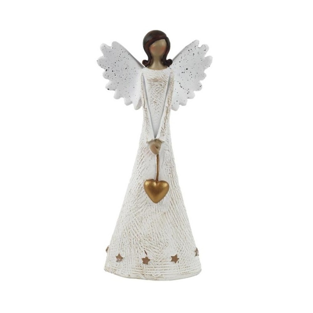 Anděl stojící se srdcem a hvězdami polyresinový zlato-bílý 14cm