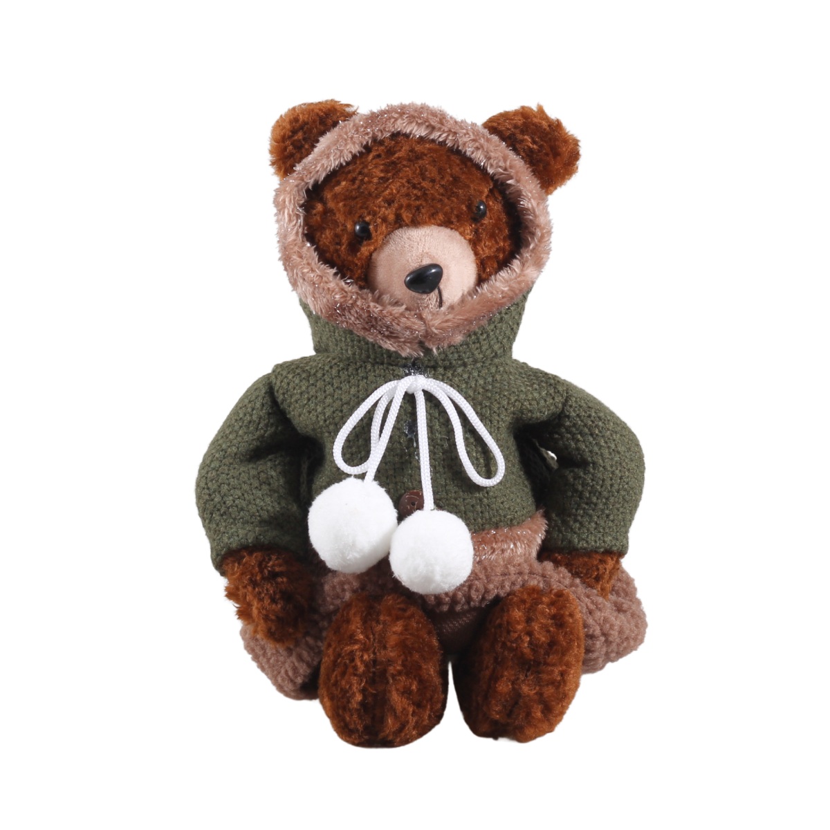 Roztomilý plyšový medvěd s hnědou srstí oblečený do zelené mikiny s kapucí a bambulkami je ideálním společníkem pro zimní období. Díky svému sedícímu provedení je stabilní a krásně vynikne jako dekorace i jako dárek.