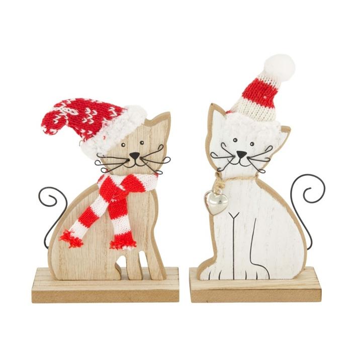 Roztomilá dřevěná kočka s čepicí na stabilním podstavci je ideální dekorací pro váš domov během zimních měsíců a Vánoc. Kombinace barev dodává výrobku útulný a přirozený vzhled, který se hodí do každého interiéru.