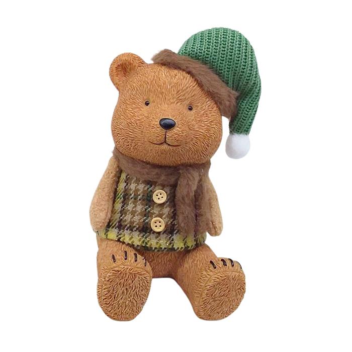 Medvěd sedící polyresinový s pletenou čepicí 20cm