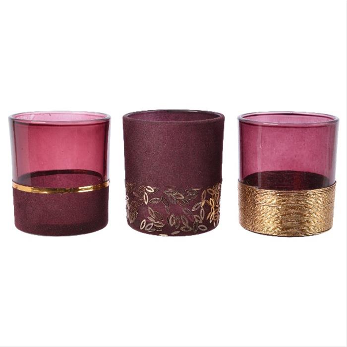 Svícen na čajovku válec zlatý lem skleněný 8cm vínový mix