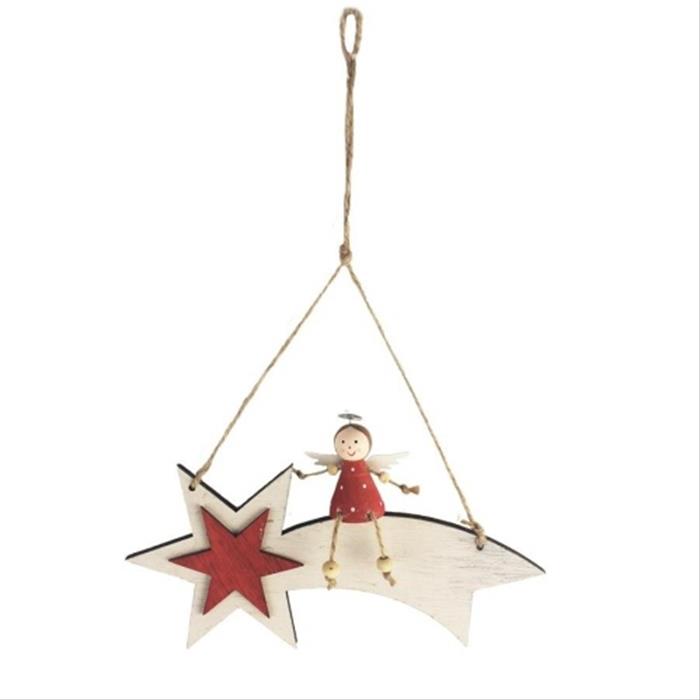 Krásná dřevěná vánoční ozdoba ve tvaru komety s motivem anděla, o velikosti 21,5 cm, v kombinaci bílé a červené barvy s decentními glitry. Tento závěsný doplněk přinese do vaší vánoční výzdoby tradiční a zároveň jemně třpytivý efekt.