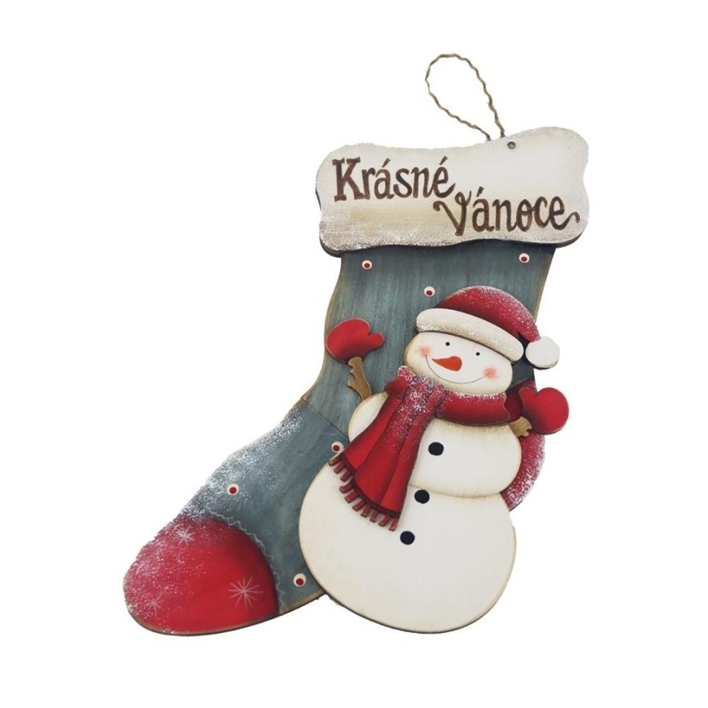 Originální vánoční dekorace v podobě dřevěné cedule ve tvaru ponožky s milým motivem sněhuláka a nápisem „Krásné Vánoce“. Ideální pro zavěšení na dveře, stěnu nebo jako součást zimní výzdoby interiéru.