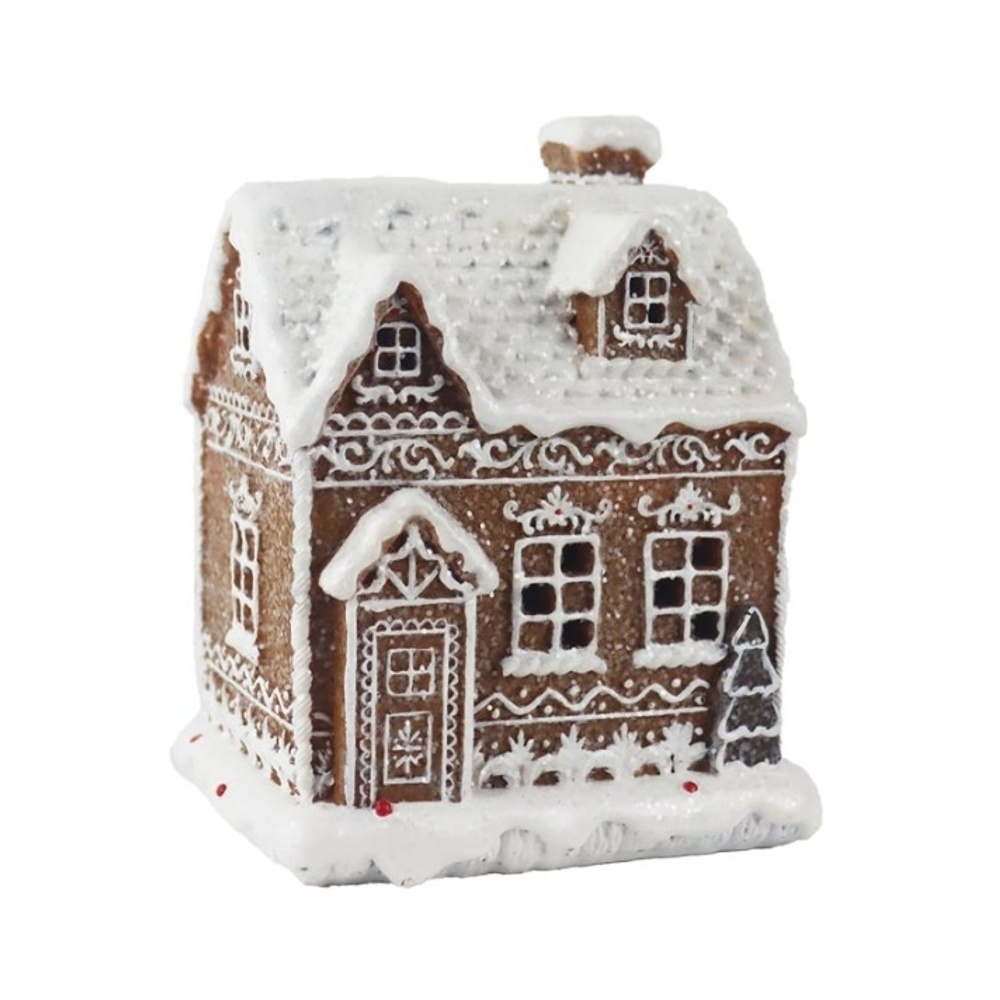 Vytvořte si tu pravou vánoční atmosféru s tímto detailně zpracovaným perníkovým domečkem. Vyroben z kvalitního polyresinu, připomíná ručně zdobené perníčky – s bohatými bílými detaily a stříškou pokrytou "sněhem". Ideální jako součást zimní vesničky nebo samostatná dekorace.