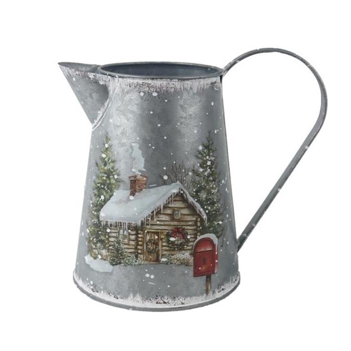 Tento kovový džbán s jedním uchem je nejen praktickým, ale i krásně stylovým kouskem zimní výzdoby. Na jeho přední straně se nachází detailní ilustrace zasněžené chalupy obklopené stromy, s červenou poštovní schránkou v popředí – jako vystřižená z vánoční pohlednice.