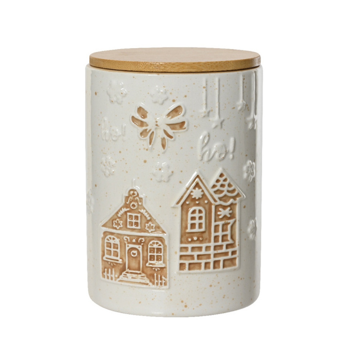 Stylová kulatá dóza z dolomitu s jemným hnědo-bílým dekorem domečků přinese do vaší kuchyně i obýváku nádech zimní atmosféry. Díky praktickému dřevěnému víčku zůstane obsah chráněný a dlouho čerstvý. Skvěle se hodí na cukroví, sladkosti, čaj nebo jiné drobnosti, které chcete mít po ruce.