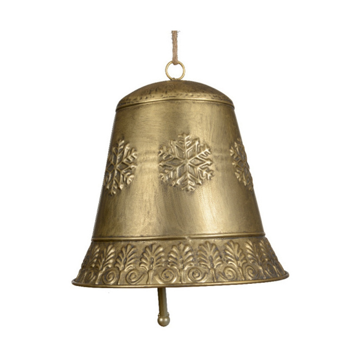 Elegantní závěsný kovový zvonek ve zlaté barvě je zdoben reliéfem vloček a jemným dekorem po obvodu. Je ideální jako vánoční dekorace do interiéru, kde navodí sváteční atmosféru. Díky závěsnému oku jej snadno umístíte na dveře, okna či stěnu.