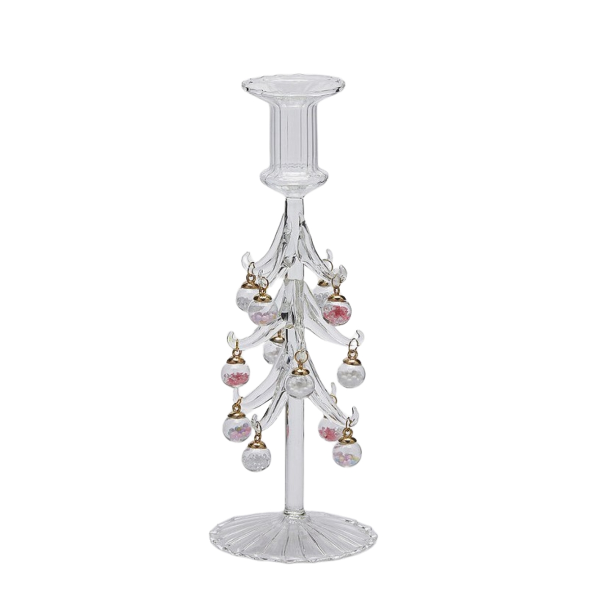 Elegantní skleněný svícen na kónickou svíčku s motivem vánočního stromku na noze a drobnými ozdobami je ideální pro vytvoření útulné sváteční atmosféry. Design svícnu kombinuje jemné sklo a dekorativní detaily, které krásně odrážejí světlo svíčky.