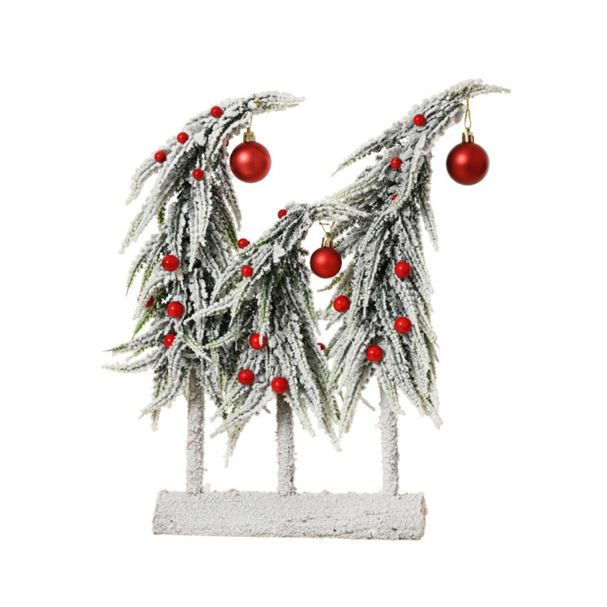 Stromky umělé zasněžené s červenými ozdobami na podstavci 3ks