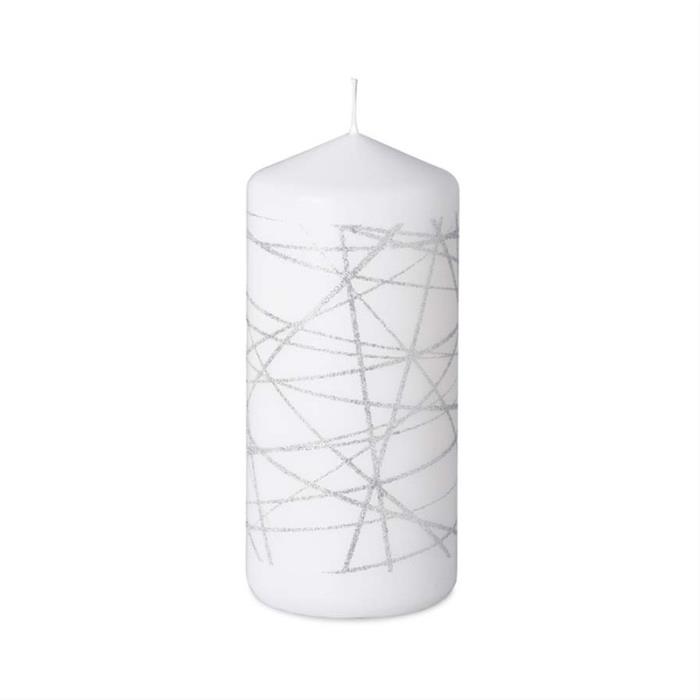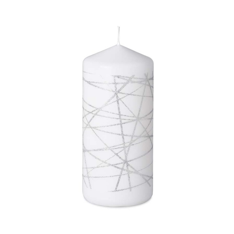 Svíčka válcová čáry s glitry bílá/stříbrná 15cm